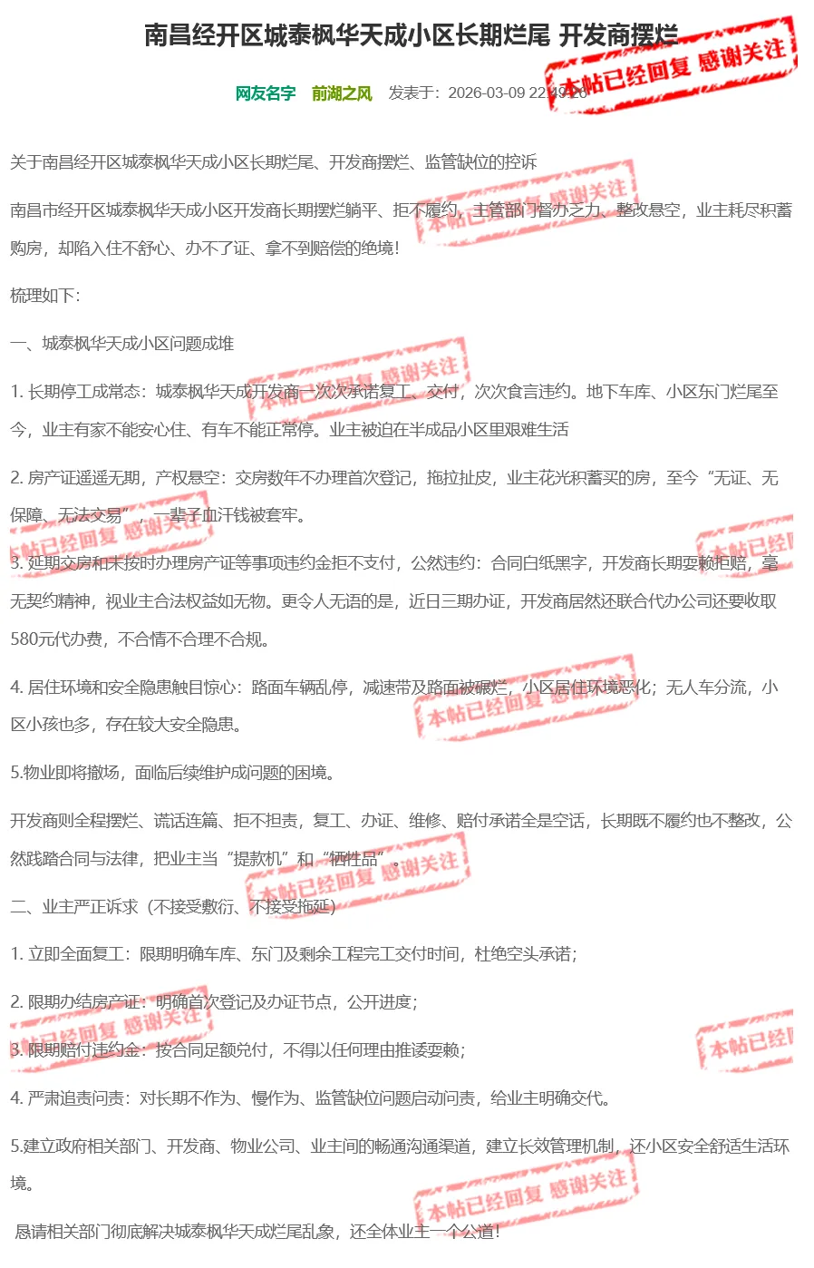 结合官方最新回复来看,城泰枫华天成15号楼的交付时间已经明确。希望相关部门能够切实履行监管职责,持续督促开发企业加快验收及办证进度,落实违约金协商解决方案,切实保障业主的合法权益。也期盼城泰枫华天成的业主们能够早日摆脱维权困境,住进安心、完整的家园。