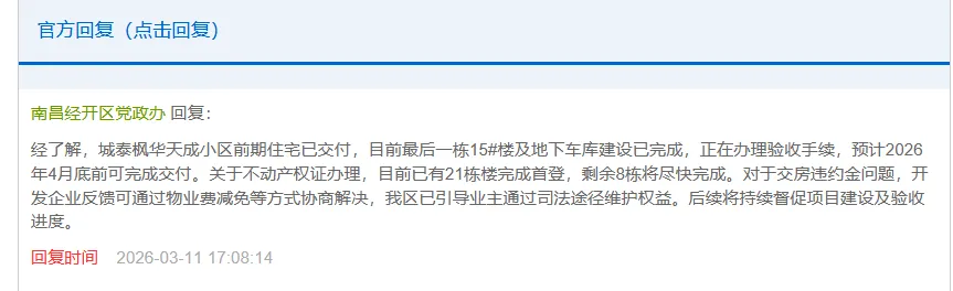 针对上述一系列问题,相关部门最新回应称:城泰枫华天成前期住宅已完成交付,最后一栋15号楼及地下车库建设已竣工,目前正推进验收手续,预计2026年4月底前可完成交付;不动产权证办理方面,已有21栋楼完成首登,剩余8栋将加快推进;关于交房违约金,开发企业提出可通过物业费减免协商解决,相关部门已引导业主通过司法途径维护自身权益,并将持续督促项目验收及建设进度。