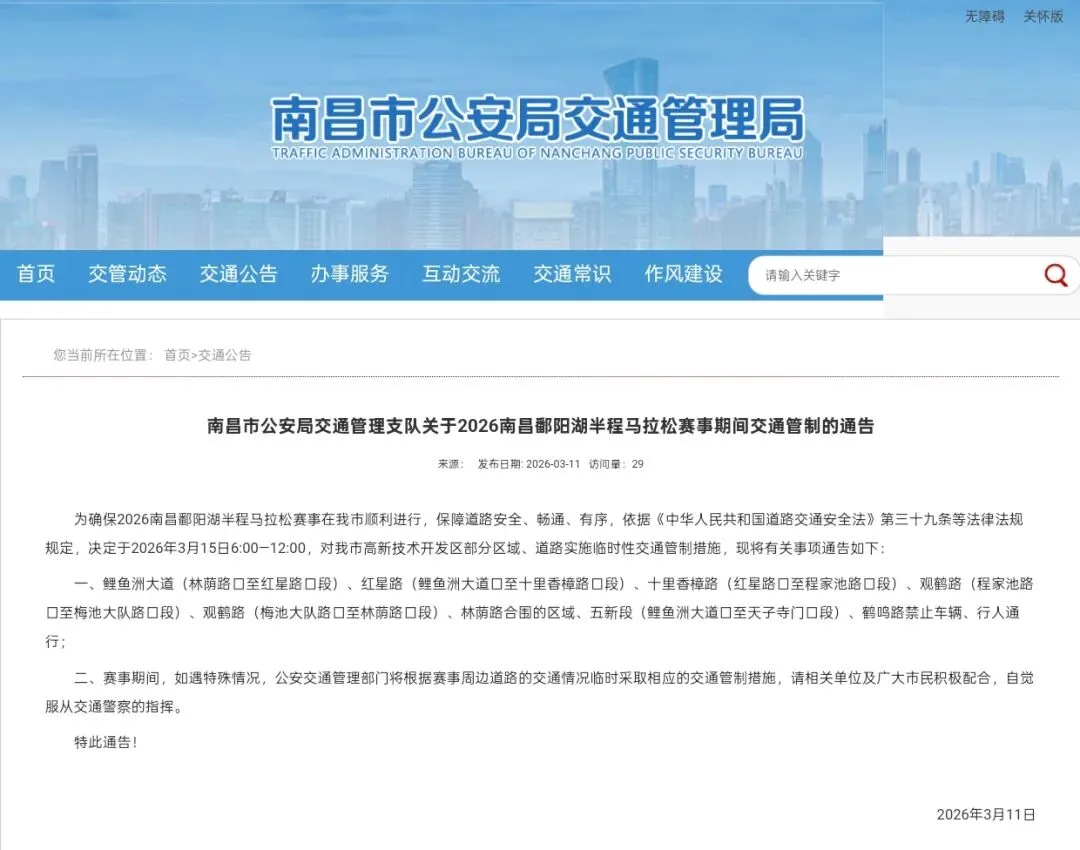 记者从南昌市公安局交通管理支队了解到,为确保2026南昌鄱阳湖半程马拉松赛事在我市顺利进行,保障道路安全、畅通、有序,依据《中华人民共和国道路交通安全法》第三十九条等法律法规规定,决定于2026年3月15日6:00—12:00,对我市高新技术开发区部分区域、道路实施临时性交通管制措施。一、鲤鱼洲大道(林荫路口至红星路口段)、红星路(鲤鱼洲大道口至十里香樟路口段)、十里香樟路(红星路口至程家池路口段)、观鹤路(程家池路口至梅池大队路口段)、观鹤路(梅池大队路口至林荫路口段)、林荫路合围的区域、五新段(鲤鱼洲大道口至天子寺门口段)、鹤鸣路禁止车辆、行人通行;