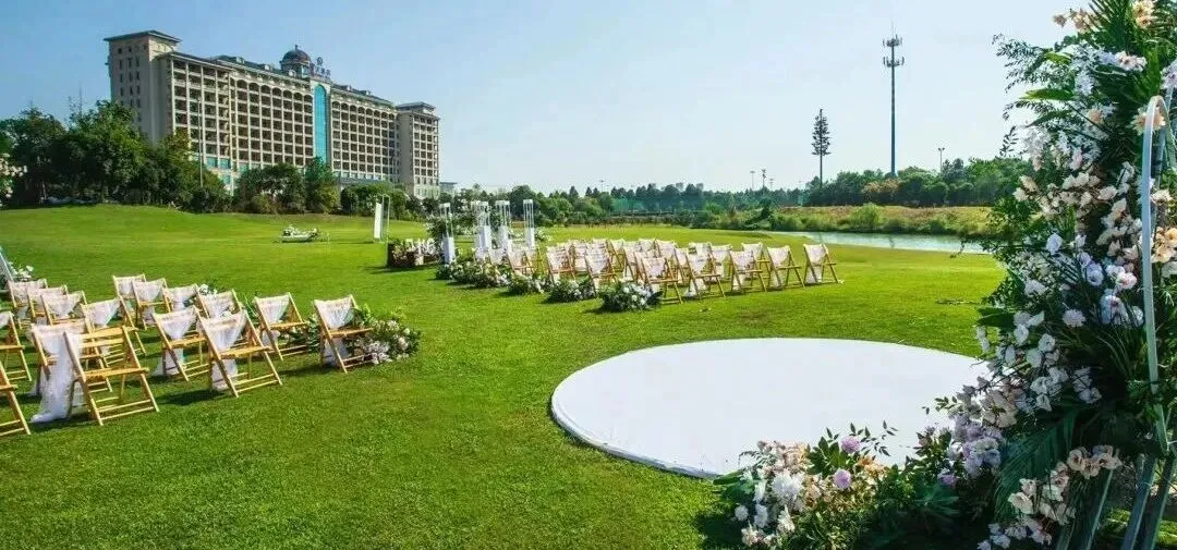 2000余平米室外婚礼草坪:绿意盎然的超大草坪,搭配专业西式婚礼布置与特色户外西式鸡尾酒会,微风轻拂,绿草如茵,让新人在自然怀抱中许下相守誓言,每一张合影都是治愈系大片,解锁别致又惊喜的户外婚礼体验。