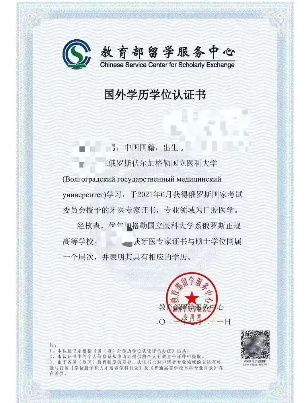 本项目获得中国(教育部)留学服务中心审批备案,项目运行全程接受中国(教育部)留学服务中心的监督和指导,伏尔加格勒国立医科大学为教育部备案的正规大学。项目学生在国外院校获得的学位证书,回国后可在中国(教育部)留学服务中心进行认证。