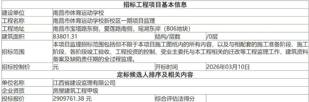 近日,从江西省公共资源交易网了解到,南昌市体育运动学校新校区一期项目监理招标结果正式公布,定标候选人为江西省建设监理有限公司。另外,项目设计、采购、施工总承包(EPC)招标结果也即将公布从规划方案看,块用地面积为247987.00平方米,容积率0.29,建筑密度15.56%,绿地率31.85%,总建筑面积为83801.31平方米,其中地上建筑面积为75414.75平方米,地下建筑面积为8386.56平方米,规划机动车停车位地上200辆,地下停车158辆,非机动车位2865。