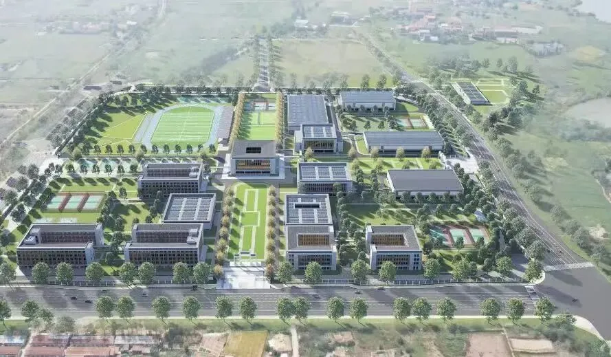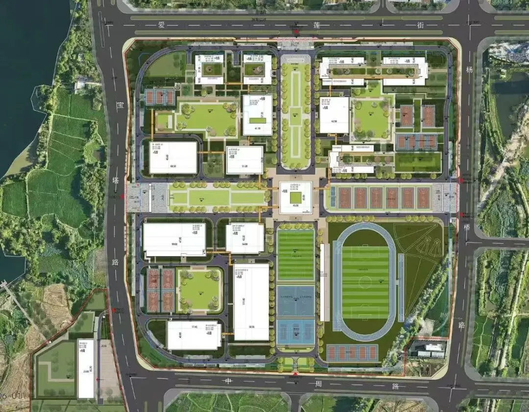 本项目地块内建筑均为新建,主要建设内容共包括两栋四层的教学楼、三栋五层的学生宿舍、一栋两层的食堂、一栋两层的办公楼、一栋四层的图书馆、一栋三层的重竞技馆、一栋一层篮球馆、一栋一层羽毛球馆、一栋两层的乒乓球馆、一栋一层的游泳馆、一栋一层的室内田径馆、一栋一层的船库、地下车库及设备房、门卫、大门、风雨连廊、看台、室外运动场地