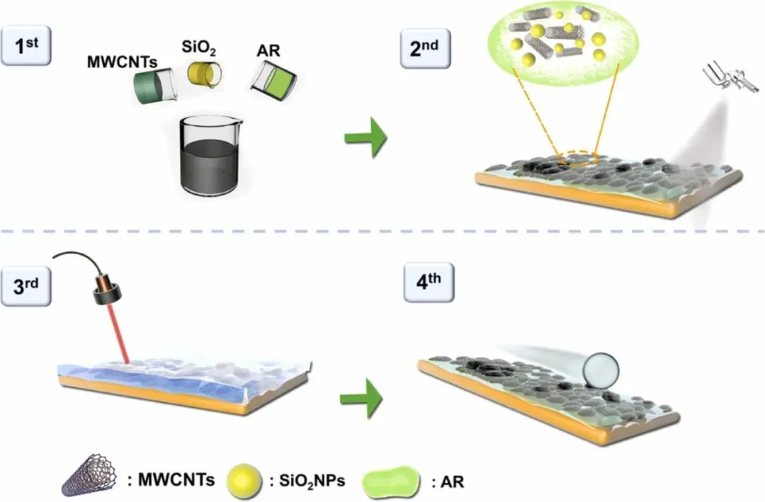 以丙烯酸酯共聚物树脂(AR)作为粘合剂,将其与多壁碳纳米管(CNTs)和疏水二氧化硅(SiO2)纳米颗粒相结合,制得ACSHx复合涂层。