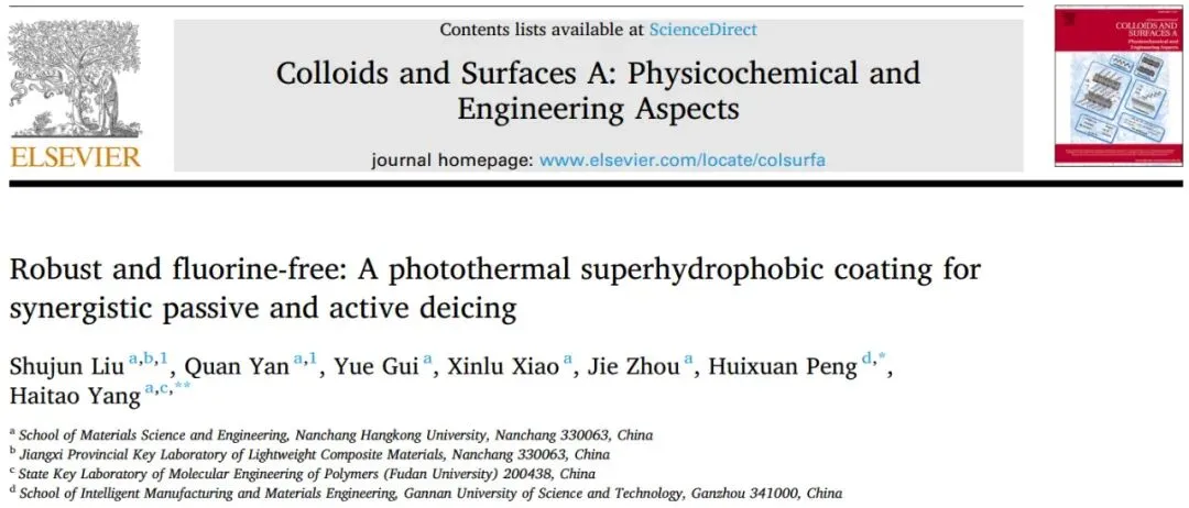 相关研究成果以“Robust and fluorine-free: A photothermal superhydrophobic coating for synergistic passive and active deicing”为标题发表在《Colloids and Surfaces A: Physicochemical and Engineering Aspects》上。