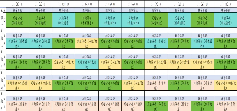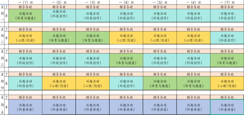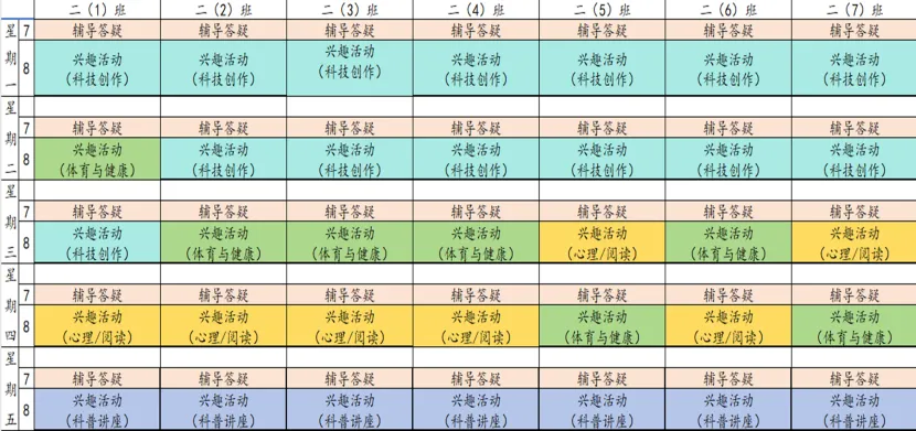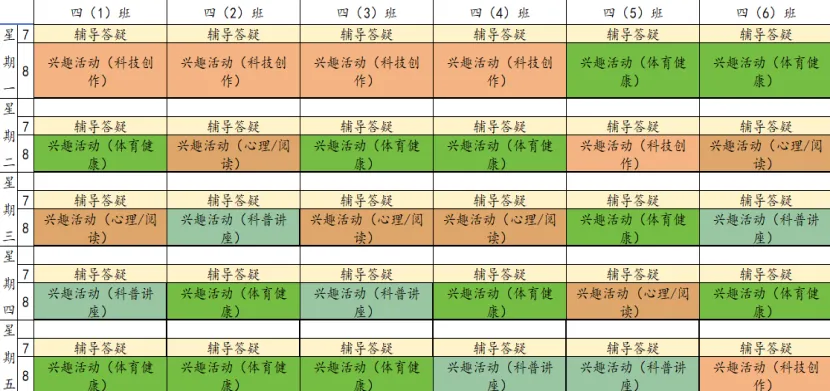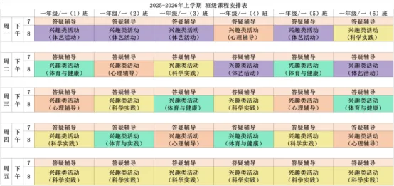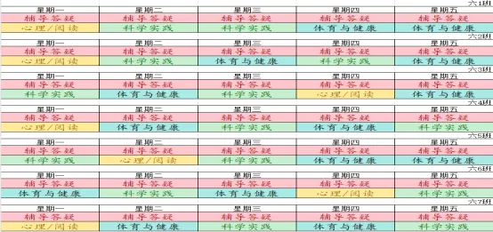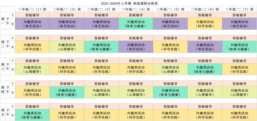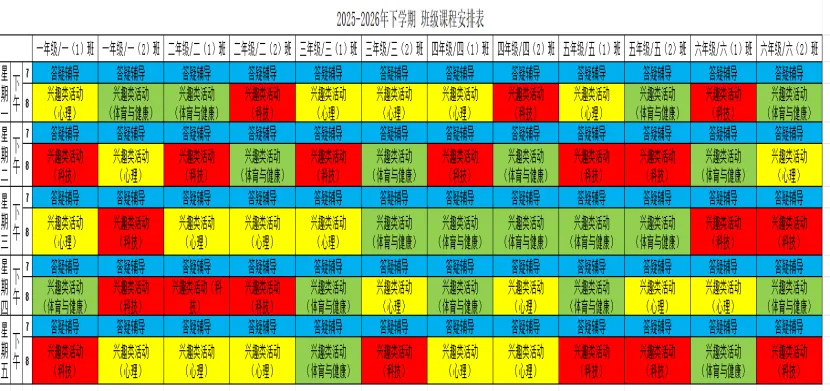 为深入贯彻落实课后服务相关文件精神,规范课后服务管理,推动课后服务提质增效,满足学生个性化成长需求。我校结合“1+N”课后服务模式设置课程,现将我校本学期课后服务课表进行公示,并自觉接受家长和社会各界的监督。邮政路校区2025-2026学年第二学期课后服务班级课表凤凰坡校区2025-2026学年第二学期课后服务班级课表天骥校区2025-2026学年第二学期课后服务班级课表射步亭校区2025-2026学年第二学期课后服务班级课表策划:教学部