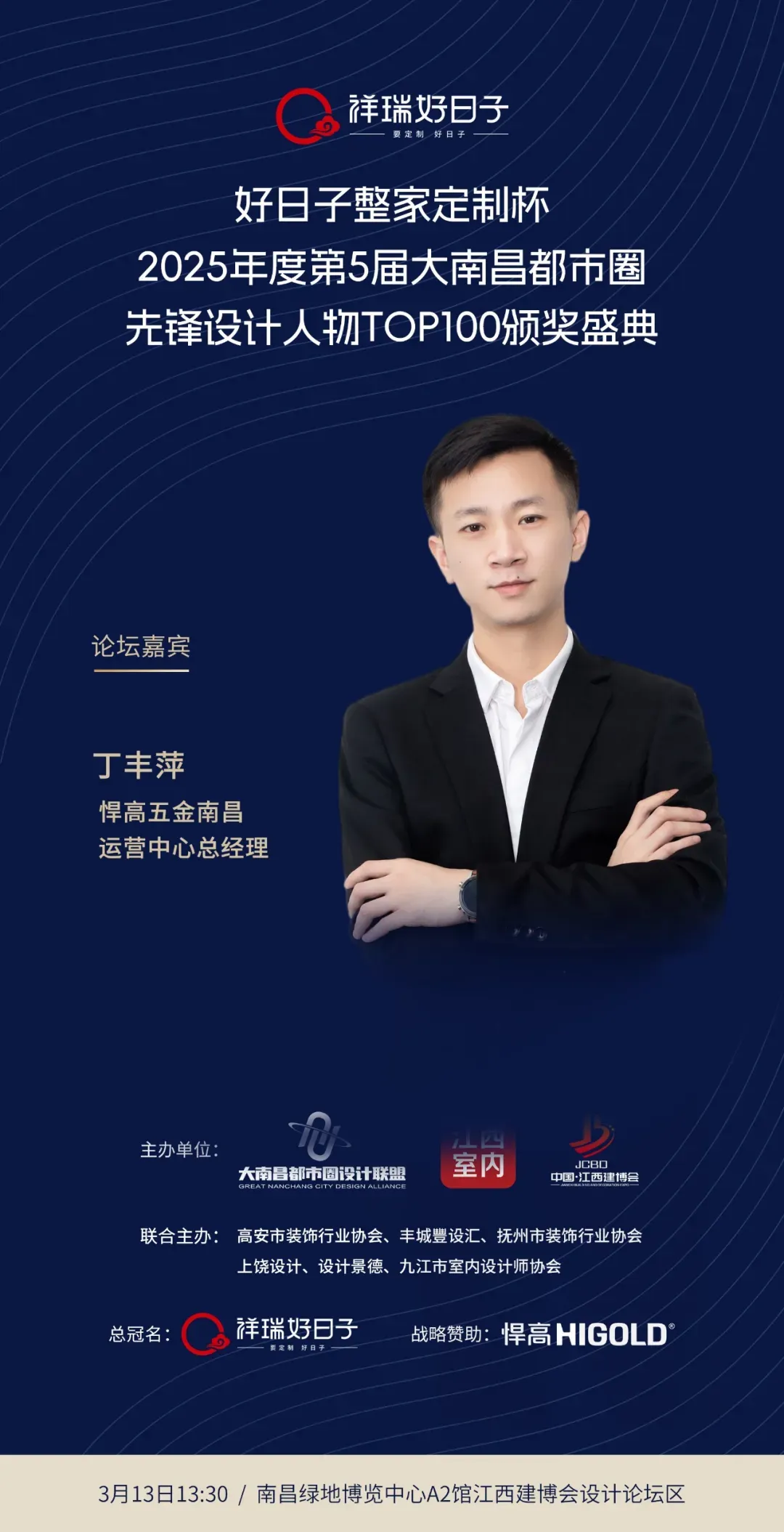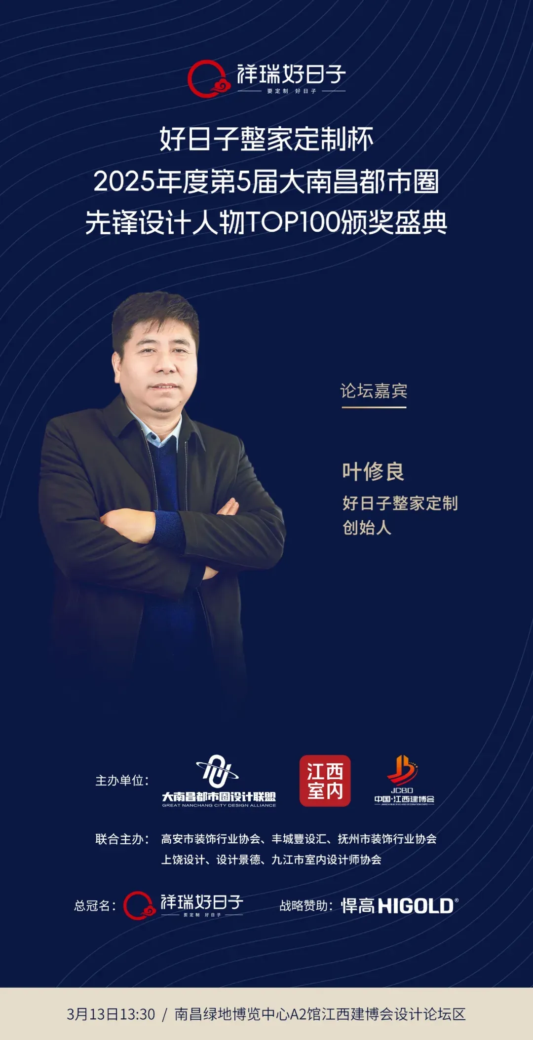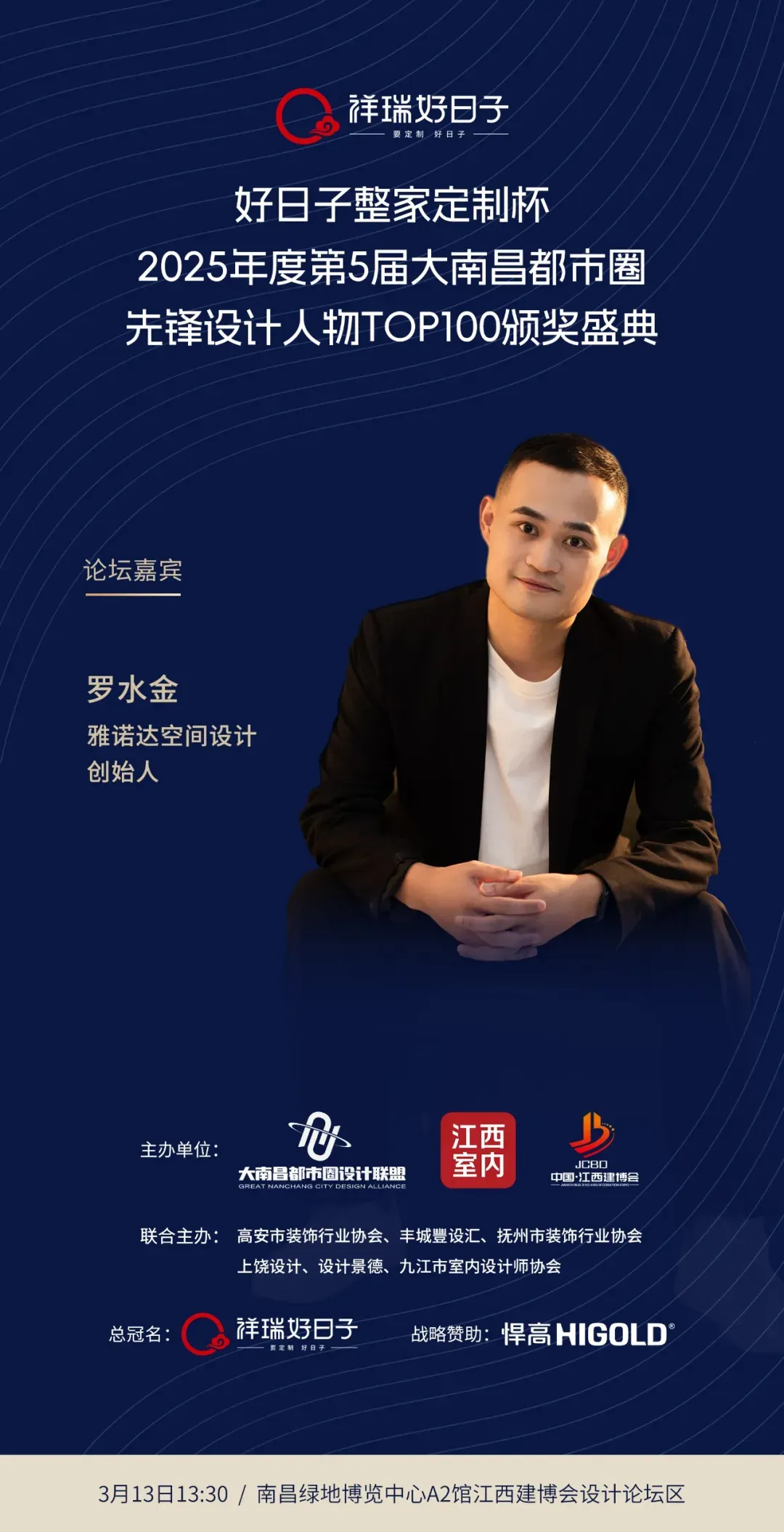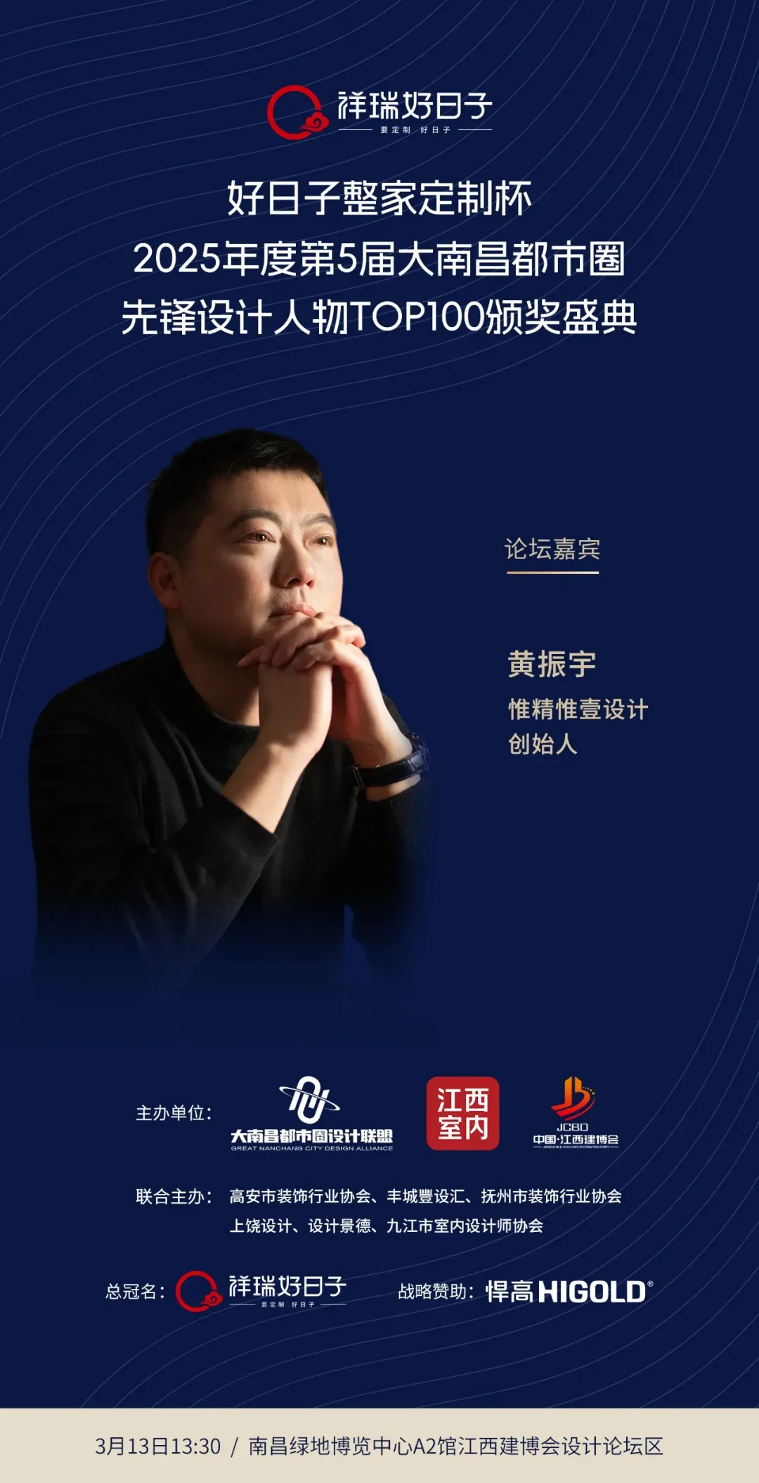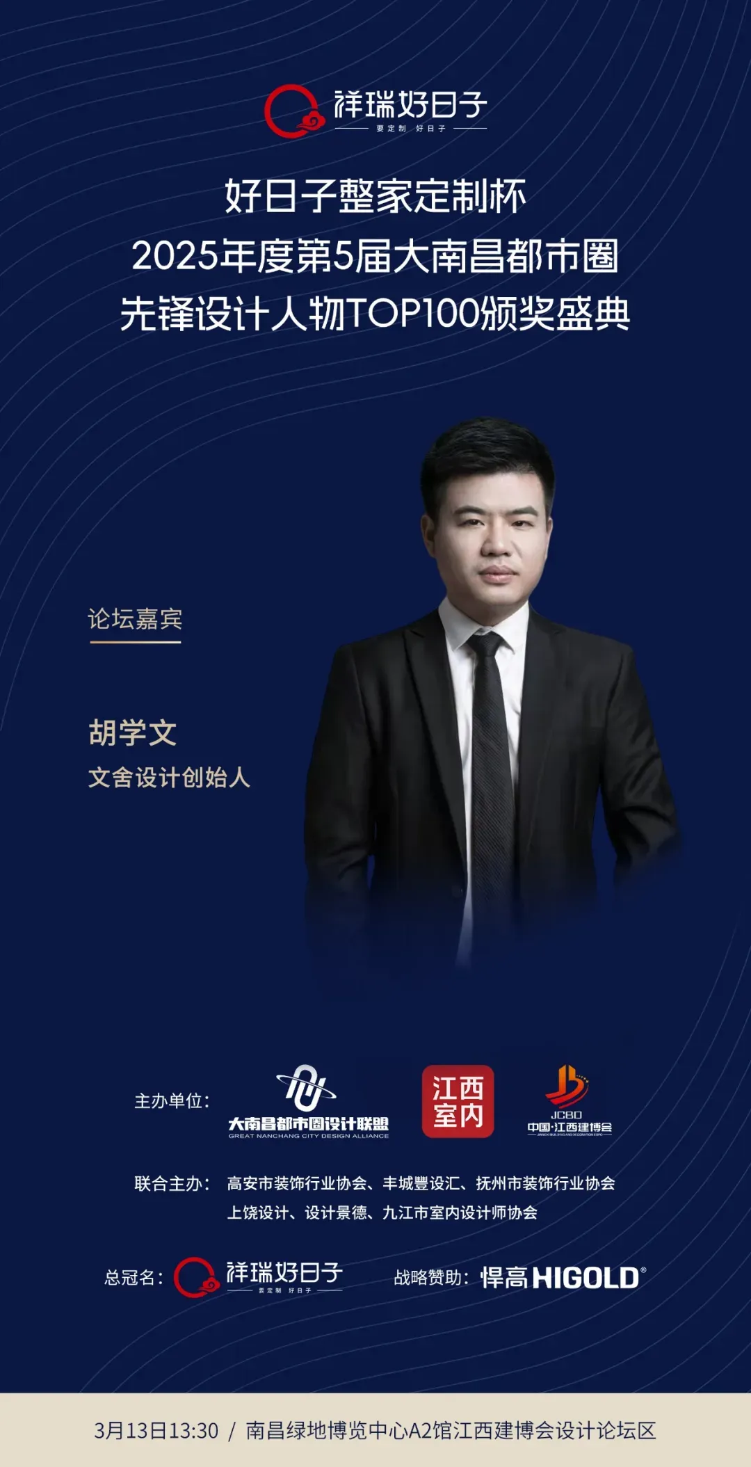 当赣江的浪潮遇见都市圈澎湃的脉动,当个体的才情融入区域共进的洪流,一场关于设计力量的崭新叙事,正在大南昌的辽阔版图上磅礴展开。在双循环发展格局与强省会战略的宏大引擎驱动下,大南昌都市圈正以前所未有的速度,编织经济、文化与人才的密集网络。产业的互动与共赢,从未像今天这般紧要。设计,作为塑造城市美学、提升空间品质、驱动商业价值的关键力量,其融合与协同发展,对于提升整个都市圈的设计水位与产业能级,具有深远的战略意义。2026年3月13日13:30,我们相约江西建博会,由大南昌都市圈设计联盟、江西室内、江西建博会主办,高安市装饰行业协会、丰城豐设汇、抚州市装饰行业协会、上饶设计、设计景德、九江市室内设计师协会联合主办,好日子整家定制总冠名,悍高五金战略赞助的“好日子整家定制杯第5届大南昌都市圈先锋设计人物TOP100颁奖盛典暨设计师喜爱的江西全屋定制厂家品牌”将隆重举行,共同见证第5届的百人榜单。打破地理界限,汇聚设计星光,以城市的维度思考,以设计的力量赋能。◎设计论坛嘉宾