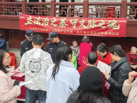 2026年3月,正值新修订《文物保护法》实施一周年,为深入贯彻新时代文物工作方针,南昌市文化广电旅游局(南昌市文物局)组织开展以“立法制之基 守文脉之魂”为主题的普法宣传活动。活动覆盖街区、景区、校园等多场景,面向市民、游客、商户、青少年等不同受众,将法治宣传与文化传承深度融合,取得了良好的社会效果,有效营造了“人人都是文物守护者”的浓厚氛围。