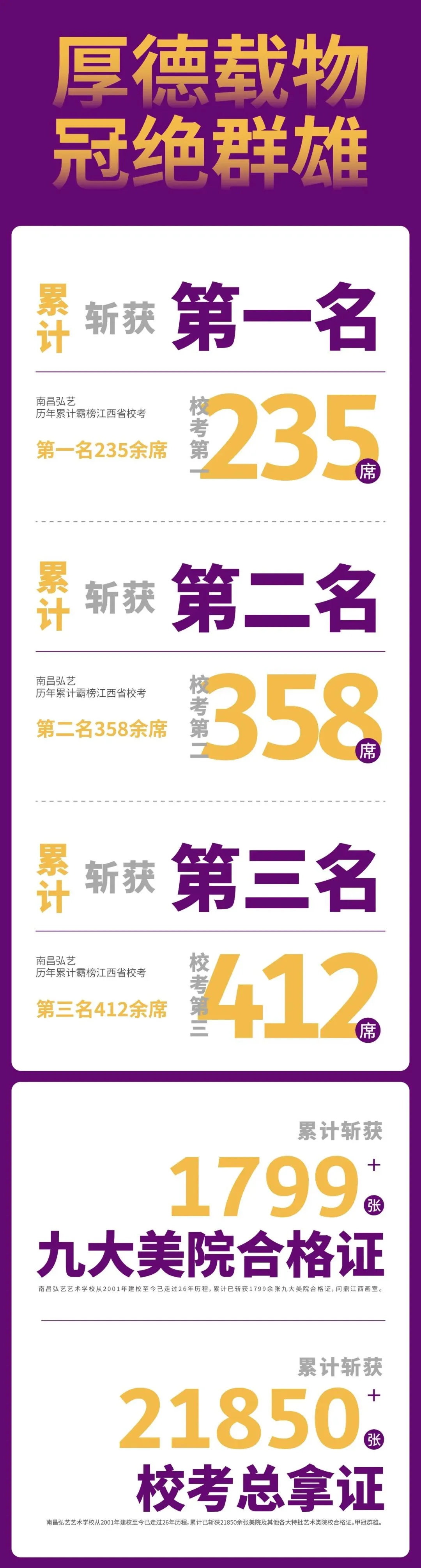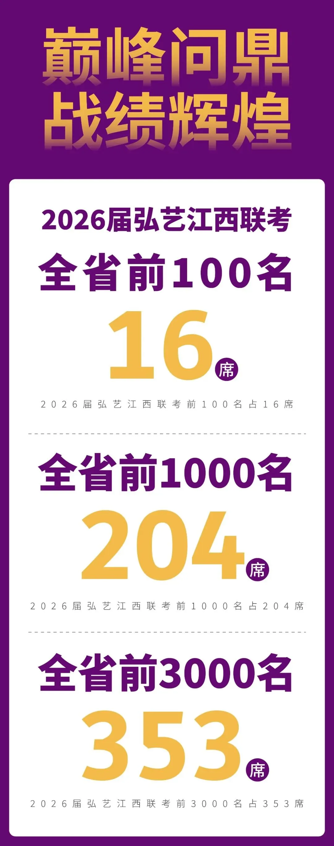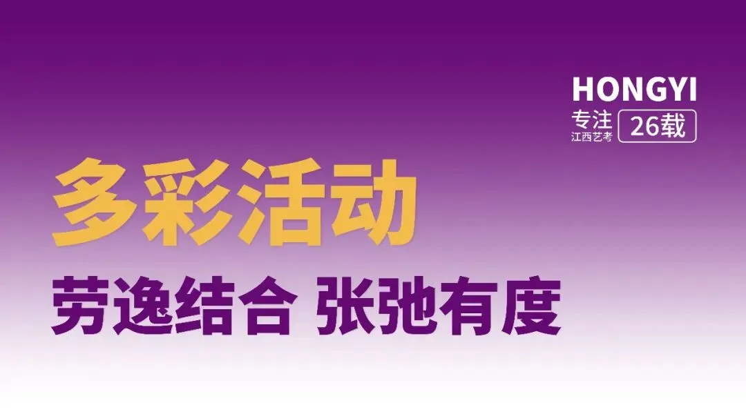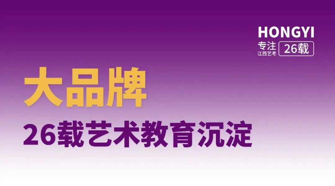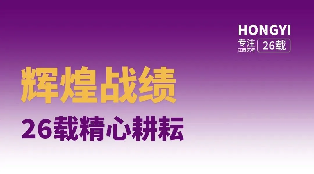 专注江西艺考26载,用精心耕耘兑现承诺,用辉煌战绩证明实力。历年联考通过率遥遥领先,名校录取通知书纷至沓来。选择弘艺,就是选择经验,选择沉淀,选择站在巨人的肩膀上备战艺考!”