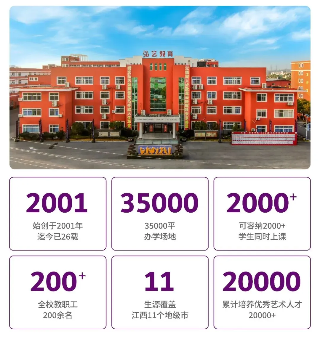 南昌弘艺艺术学校自2001年创办以来,深耕江西艺考二十六载,行稳致远、底蕴厚重,是江西省仅此一家同时持有艺术类与文化课双项办学许可的合规艺考机构,办学资质齐全、规范可靠。学校汇聚优秀艺术教研精英,师资专业严谨,教学体系成熟,以匠心育人。