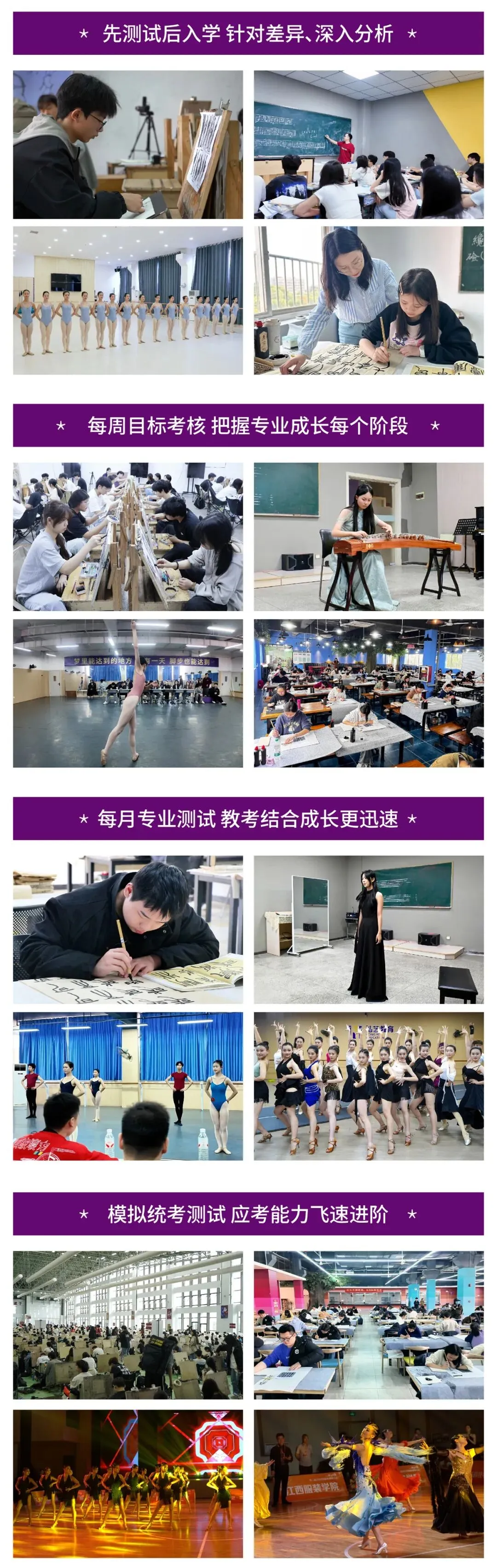 高强度集训与以考代练相结合,强化应试技巧、查漏补缺,全力冲刺统考与校考,决胜艺考战场。