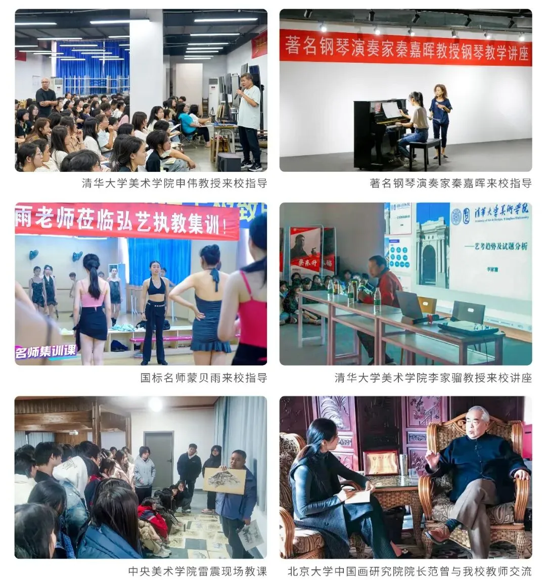 为进一步开拓学生对所学专业深层次的认识与感悟,学校不定期邀请美术、音乐、舞蹈、书法、传媒等艺术领域大咖莅临我校开展讲座与授课,老师、学生与之面对面交流请教,受益匪浅。