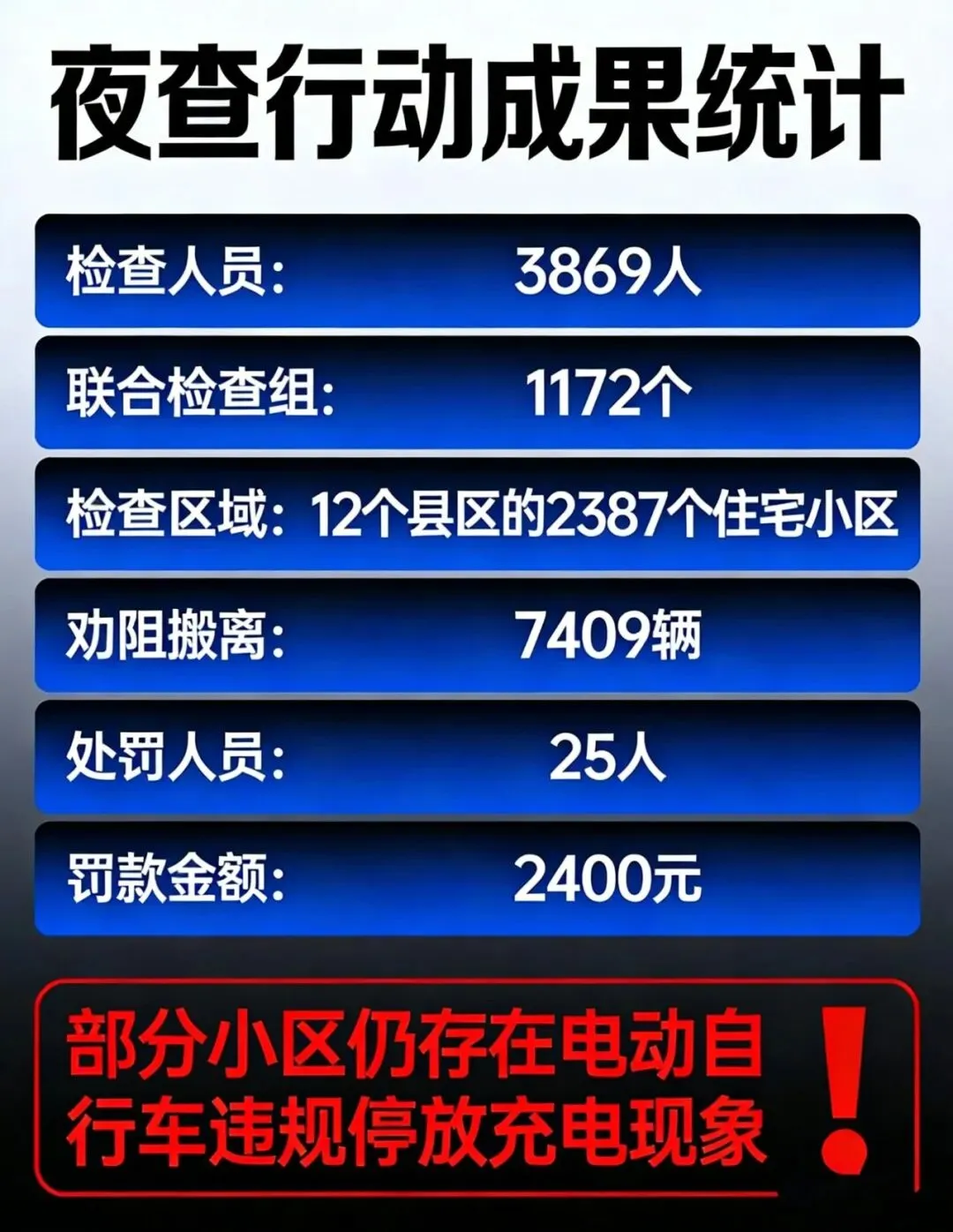 3月9日至11日,南昌消防会同相关部门,发动乡镇、街办、社区、村(居)委会、住宅小区物业服务企业等检查人员3869人,组织联合检查组1172个,对12个县区的2387个住宅小区开展了错时检查,发现部分住宅小区仍存在电动自行车违规停放充电等现象,共劝阻搬离违规停放充电车辆7409辆,处罚人员25人,罚款2400元。