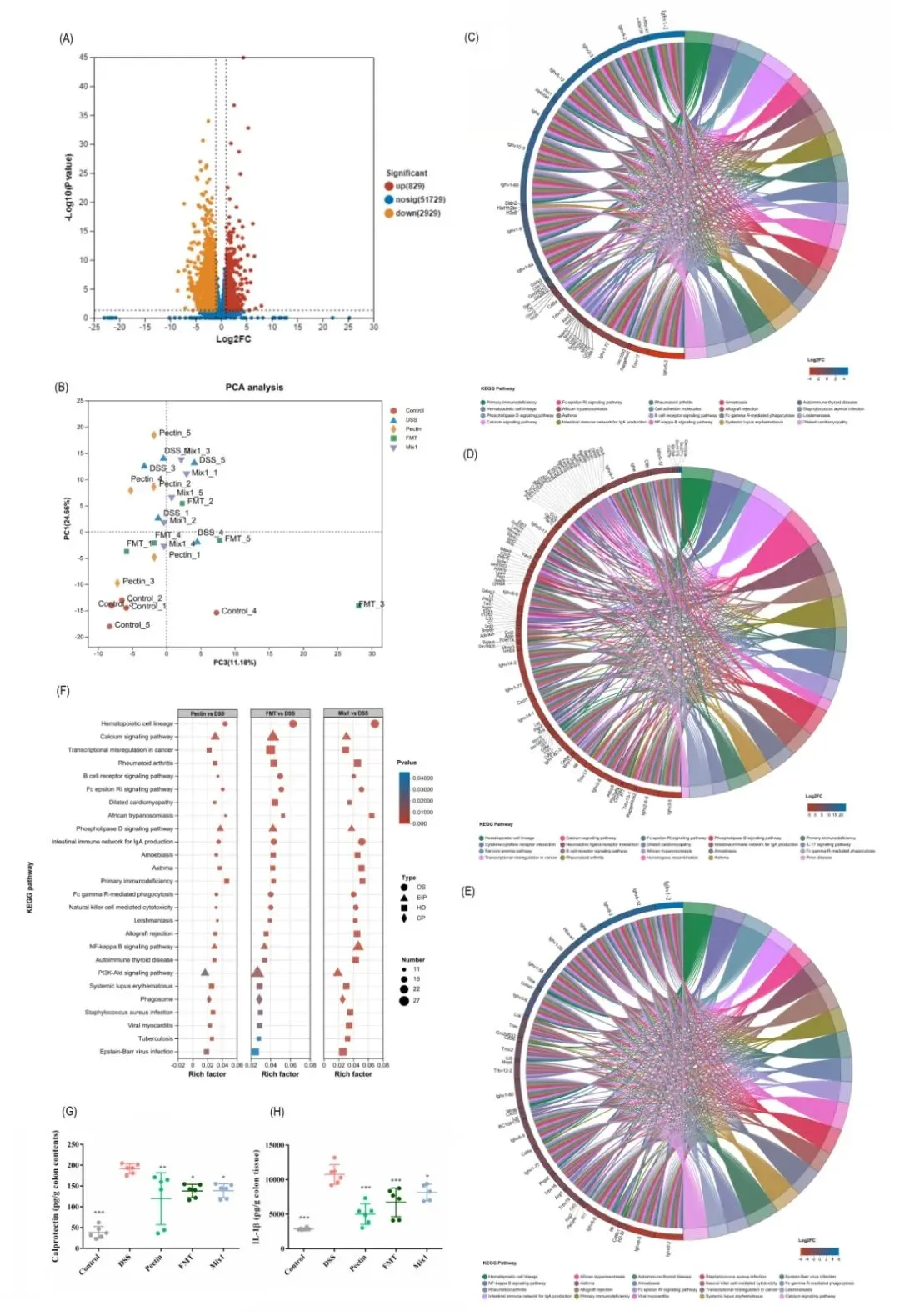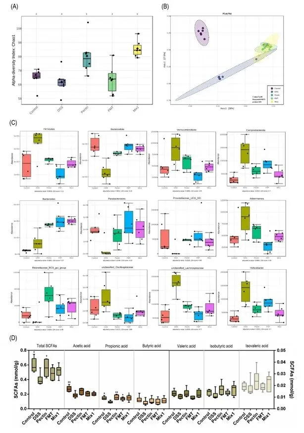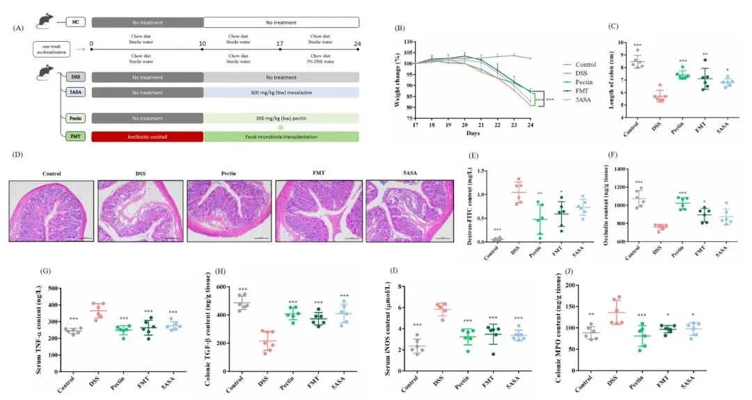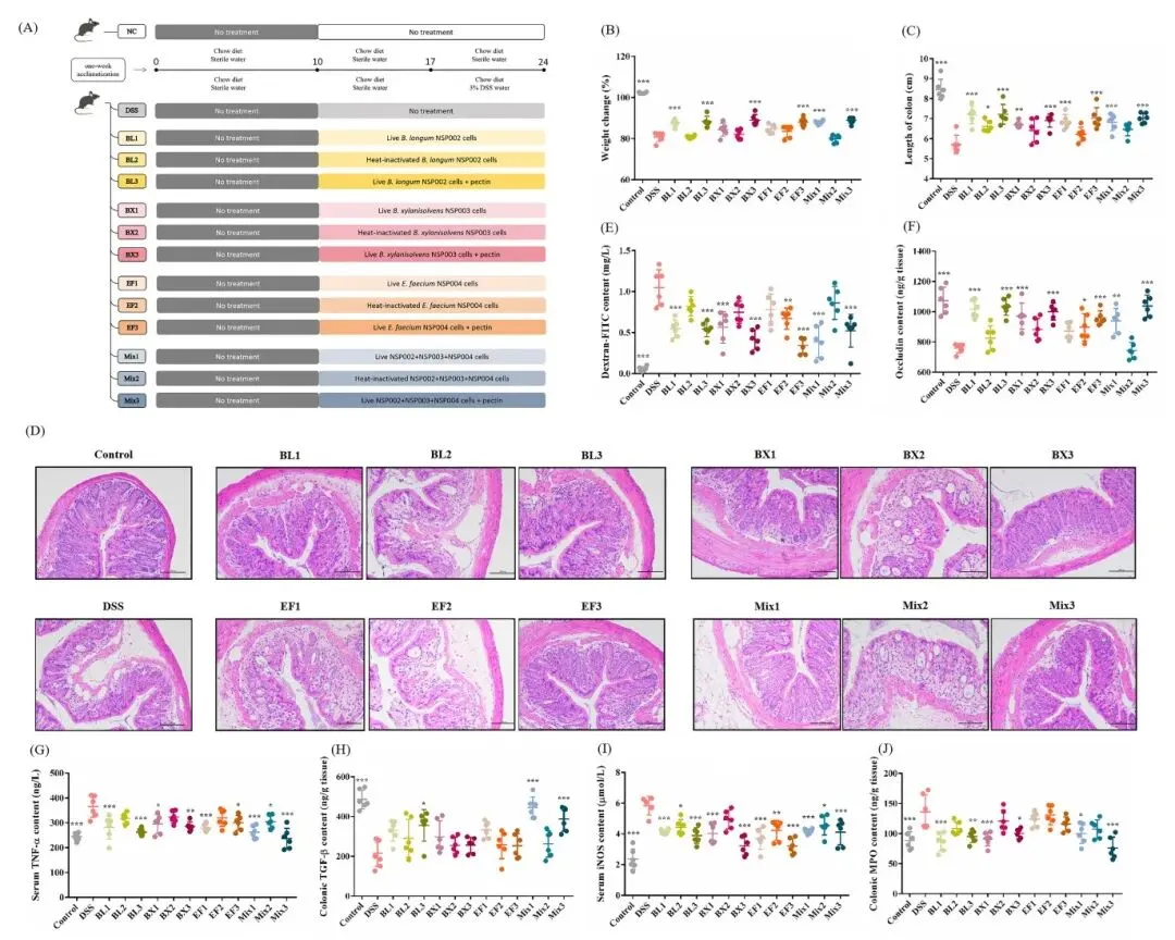 在单独肠道菌干预组中,长双歧杆菌NSP002活菌及其与果胶复配后,可改善小鼠体重及器官指数,缓解肠道炎性浸润,降低小鼠DAI值和肠道通透性,降低促炎因子及氧化应激水平;灭活菌仅可降低小鼠血清iNOS水平。解木聚糖拟杆菌NSP003活菌,可改善小鼠体重减轻、DAI值和脾脏指数,缓解结肠炎性浸润,降低氧化应激水平;与果胶复配后,还能够增加结肠长度,降低肠道通透性及炎症因子水平;灭活菌无明显改善作用。屎肠球菌NSP004活菌,可改善结肠炎小鼠肠道缩短情况,降低促炎因子TNF-α的分泌和iNOS的含量;与果胶复配后,还可显著改善体重减轻、DAI值及器官指数,缓解结肠炎性浸润;灭活菌仅上调了Occludin、下调了iNOS含量。