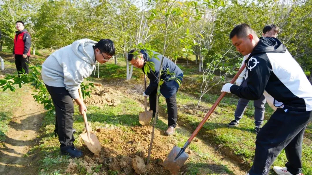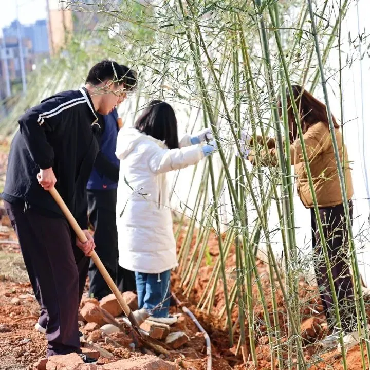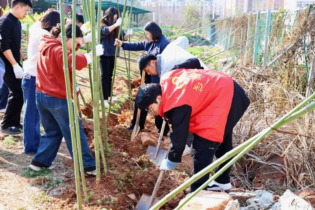 各部门教职工、各学院师生代表们分工协作、配合默契。大家手握铁锹,躬身铲土挖窝,小心翼翼扶正树苗,层层填土压实,再提水浇灌定根,每一个步骤都一丝不苟,专业的绿化技术人员在旁实时指导,叮嘱种植要领,确保树苗栽种的成活率。