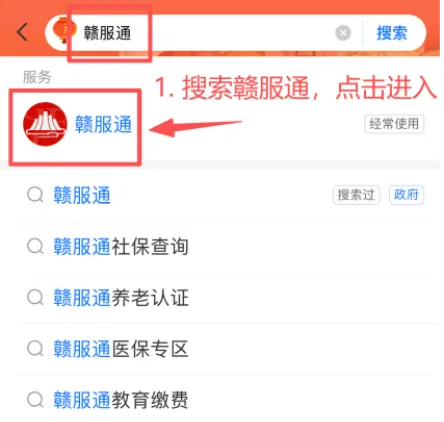 ➢ 1.打开支付宝,在搜索栏输入“赣服通”,进入赣服通小程序;