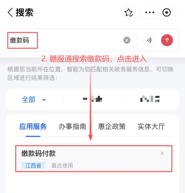 ➢2.在赣服通页面搜索栏输入“缴款码”,点击进入“缴款码付款”服务;