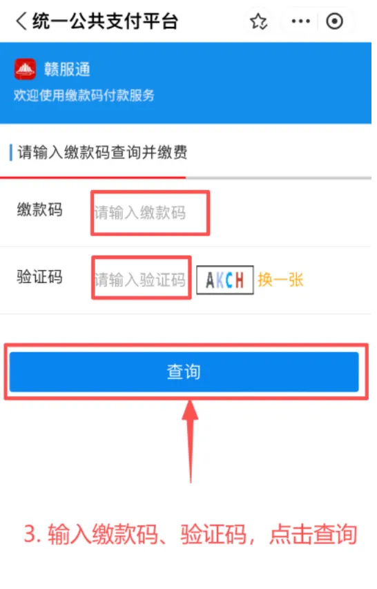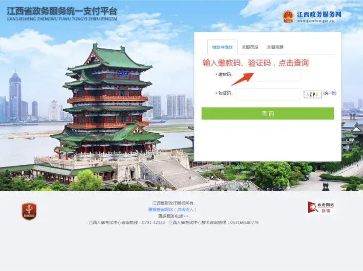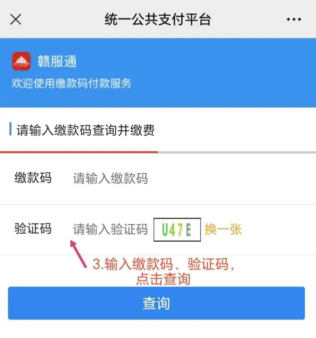 ➢ 3.进入江西省统一公共支付平台,输入缴款码和验证码,点击“查询”;