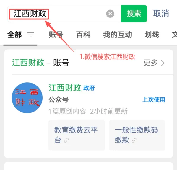 ➢ 1.打开微信,在搜索栏输入“江西财政”,关注江西省财政厅官方微信公众号;