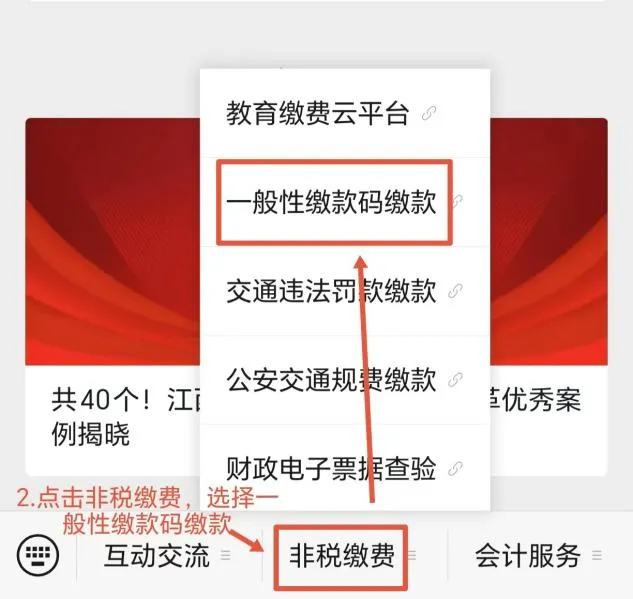 ➢ 2.进入公众号后,点击菜单栏“非税缴费”,选择“一般性缴款码缴款”;
