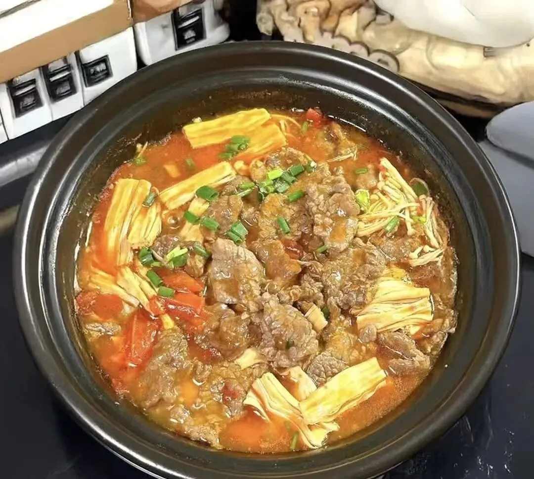 小米米饭、番茄腐竹牛肉煲、蒜香黄白菜、雪梨百合肉饼汤