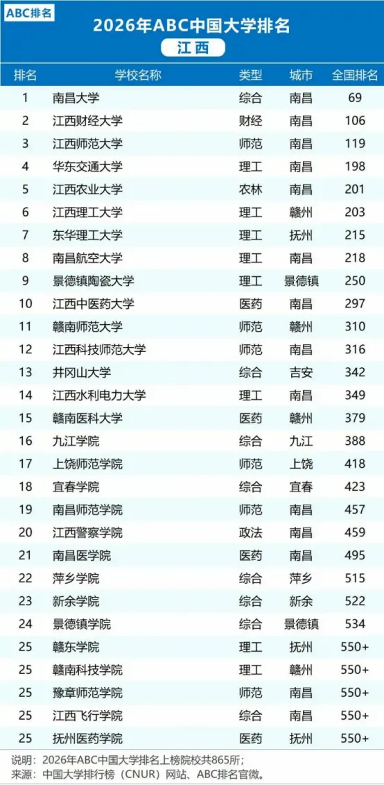 2026年ABC中国大学排名正式公布,江西省共有25所普通本科院校上榜,榜单能够看出省内高校在全国范围内的实力分布情况,也能体现出各高校近几年的发展轨迹以及位次变化,南昌大学以全国第69名的成绩继续领跑全省,是江西唯一一所全国百强高校,也是省内唯一一所综合类大学中排名最高的院校,江西财经大学紧跟其后,全国排名第106名,在财经类院校中保持着较高的竞争力,是江西省内财经领域的核心高校。 南昌航空大学以全国第218名进入省内前八,其工科特色和航空背景为其综合排名提供有力支撑,井冈山大学位列全国第342名,作为革命老区高校,在教育、人文及区域发展研究方面持续发挥作用,此次排名部分高校位次明显调整,有的稳步上升,有的略有下滑,整体格局“头部稳定、中部竞争加剧、尾部逐步整合”。