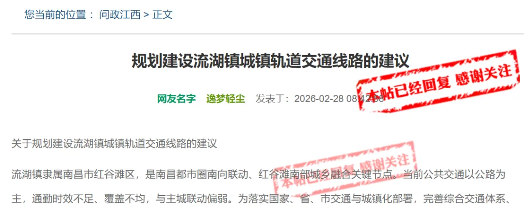 目前,根据官方问政平台公示内容显示,有网友对规划建设流湖镇城镇轨道交通线路提出建议。
