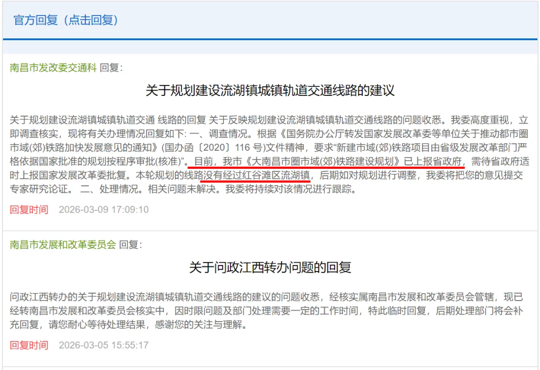 目前,南昌市《大南昌市圈市域(郊)铁路建设规划》已上报省政府,需待省政府适时上报国家发展改革委批复。