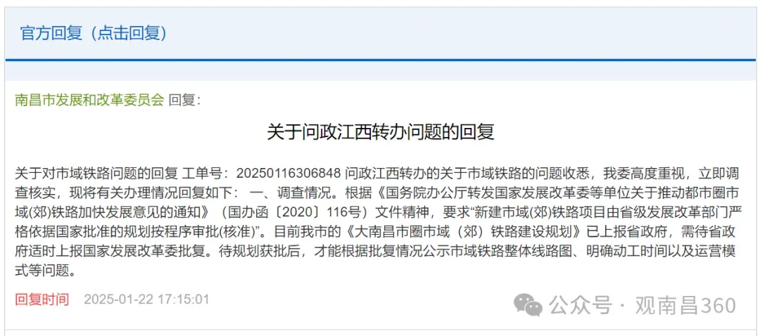 对此,南昌市发改委交通科最新回复表示,根据《国务院办公厅转发国家发展改革委等单位关于推动都市圈市域(郊)铁路加快发展意见的通知》(国办函[2020]116号)文件精神,要求“新建市域(郊)铁路项目由省级发展改革部门严格依据国家批准的规划按程序审批(核准)。