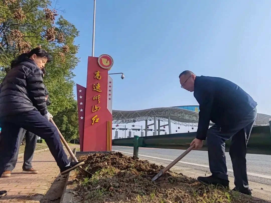 机场路收费所的职工们则来到综合服务站前花坛,开展植树栽绿活动。大家自带工具,小心翼翼地将花苗从容器中取出,扶正幼苗、挥锹填土、踩实培土,再缓缓浇上清水,每一个环节都认真细致。原本略显空旷的花坛,在大家的共同劳作下,一株株新栽的植物错落有致、迎风挺立,为过往司乘营造出更加清新雅致的通行环境。
