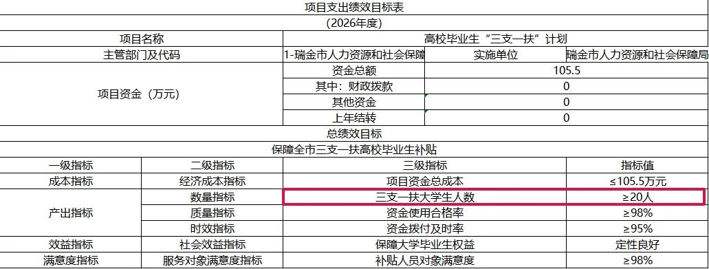 今年瑞金人社局发布的部门重点项目绩效目标表中表明,“三支一扶培训人数≥20人”。