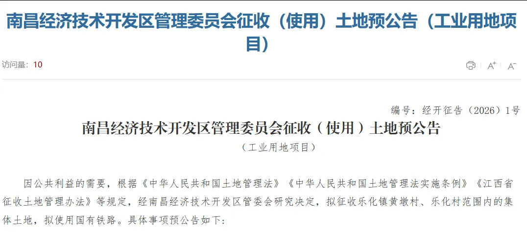 2026年3月5日,南昌经开区管委会发布今年第一份征地预公告,面积高达上百亩。