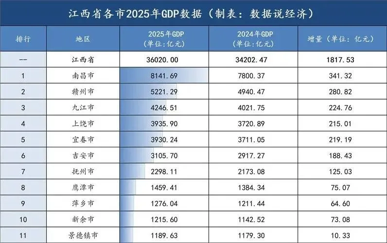 再看经济账。2025年南昌GDP达到8141.69亿元,名义增长4.31%,稳稳坐在全省第一把交椅上,体量是第二名赣州的1.56倍。景德镇这边的情况就有点尴尬了——2025年规模以上工业增加值下降了13.5%,GDP增速为负,排名甚至被新余反超,跌出了全省前十。