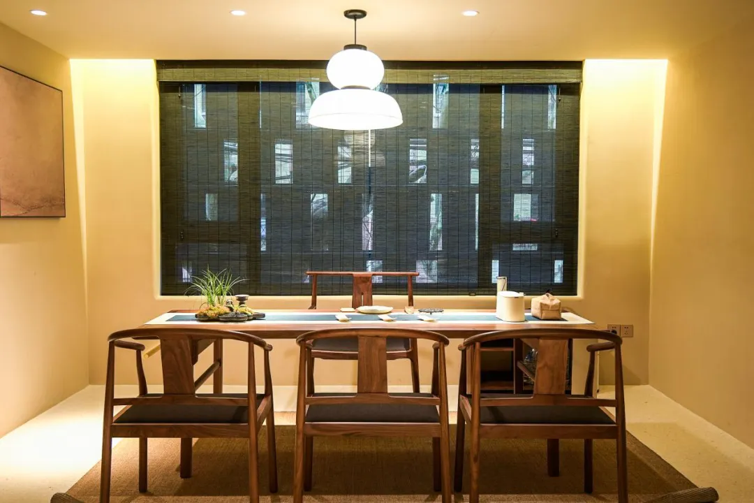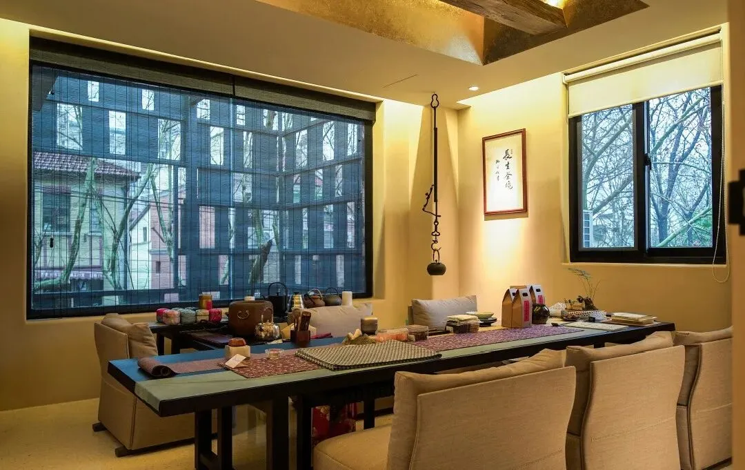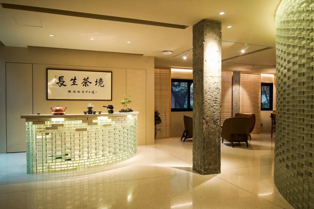 俗话说,道家养神,但是长生茶境却更养“性”,茶馆不在繁华的闹市区域,藏匿在人文气息浓厚的南昌路深巷里,茶馆大门的设计十分讲究“侘寂”美学,“长生”二字分别用繁体和“耐人寻味”的符号来展示,无论是从空间还是从艺术角度出发都体现出了“长生”二字,意境非凡。
