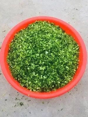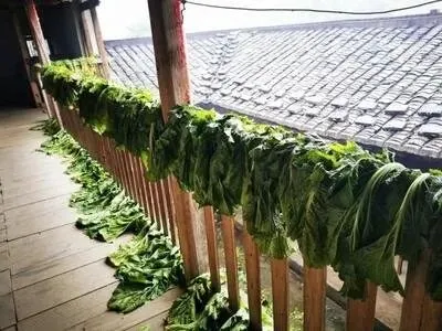 冬天的时候,芥(gai)菜卖得很便宜,专买菜叶不要兜,更加便宜。我们把芥菜叶一皮一皮地洗干净,铺在户外晾晒。几天之后,菜叶里的水分干了八九成,但是颜色还是绿的。