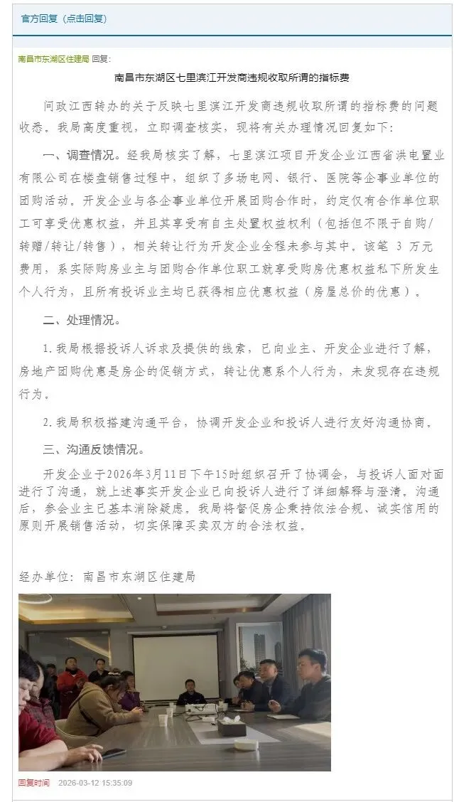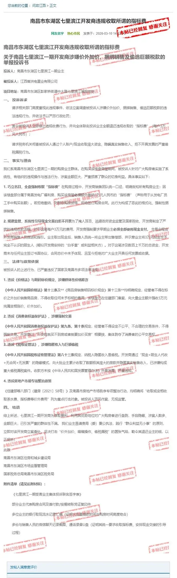 3月10日网友“热心市民”在“问政江西”平台发布了《南昌市东湖区七里滨江开发商违规收取所谓的指标费》举报投诉书,详细陈述了购房过程中的经历: