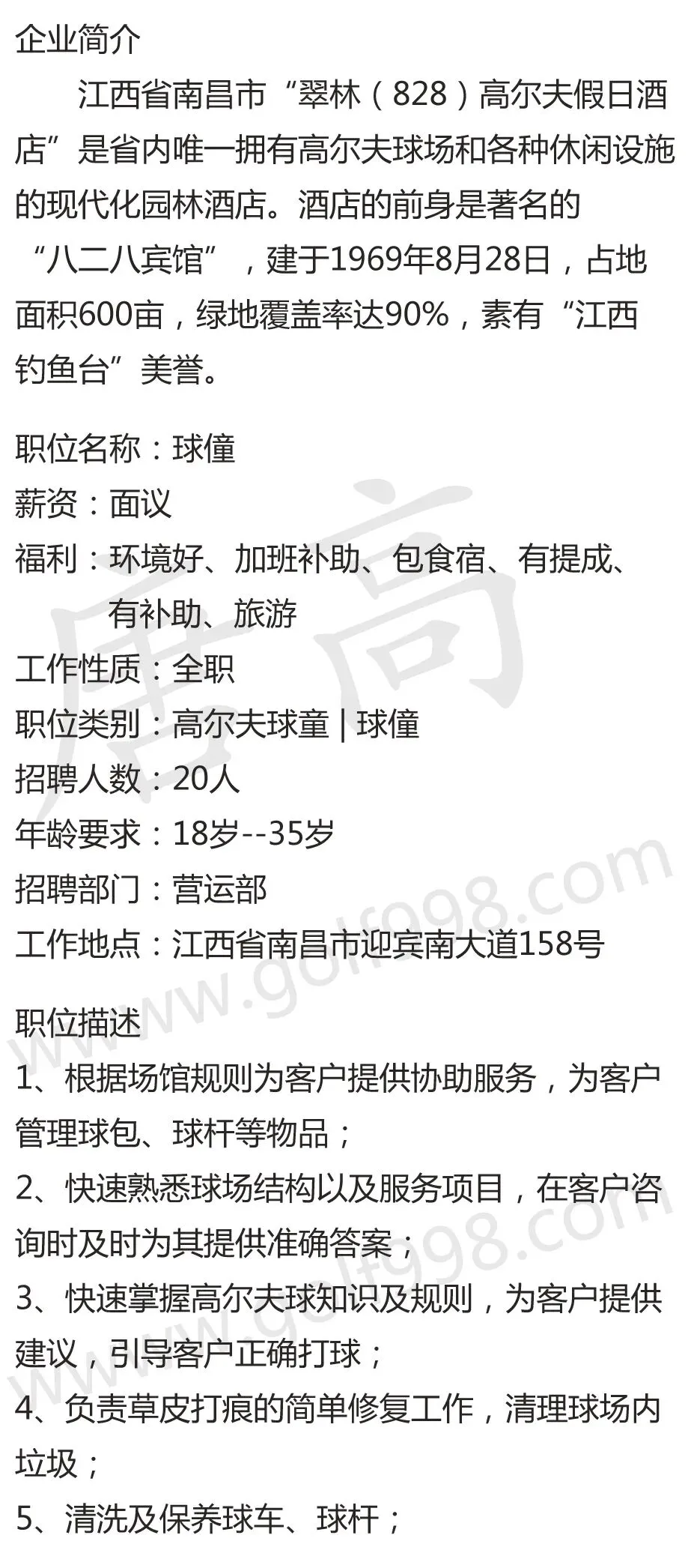 >【聘】球童 南昌翠林高尔夫俱乐部