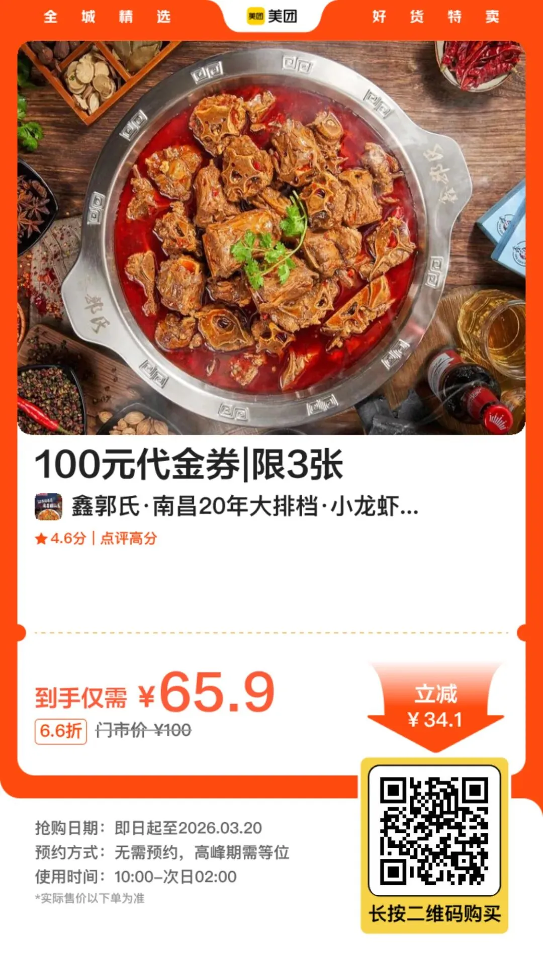 >南昌「鑫郭氏·南昌大排档」优惠券:66抵100可叠加
