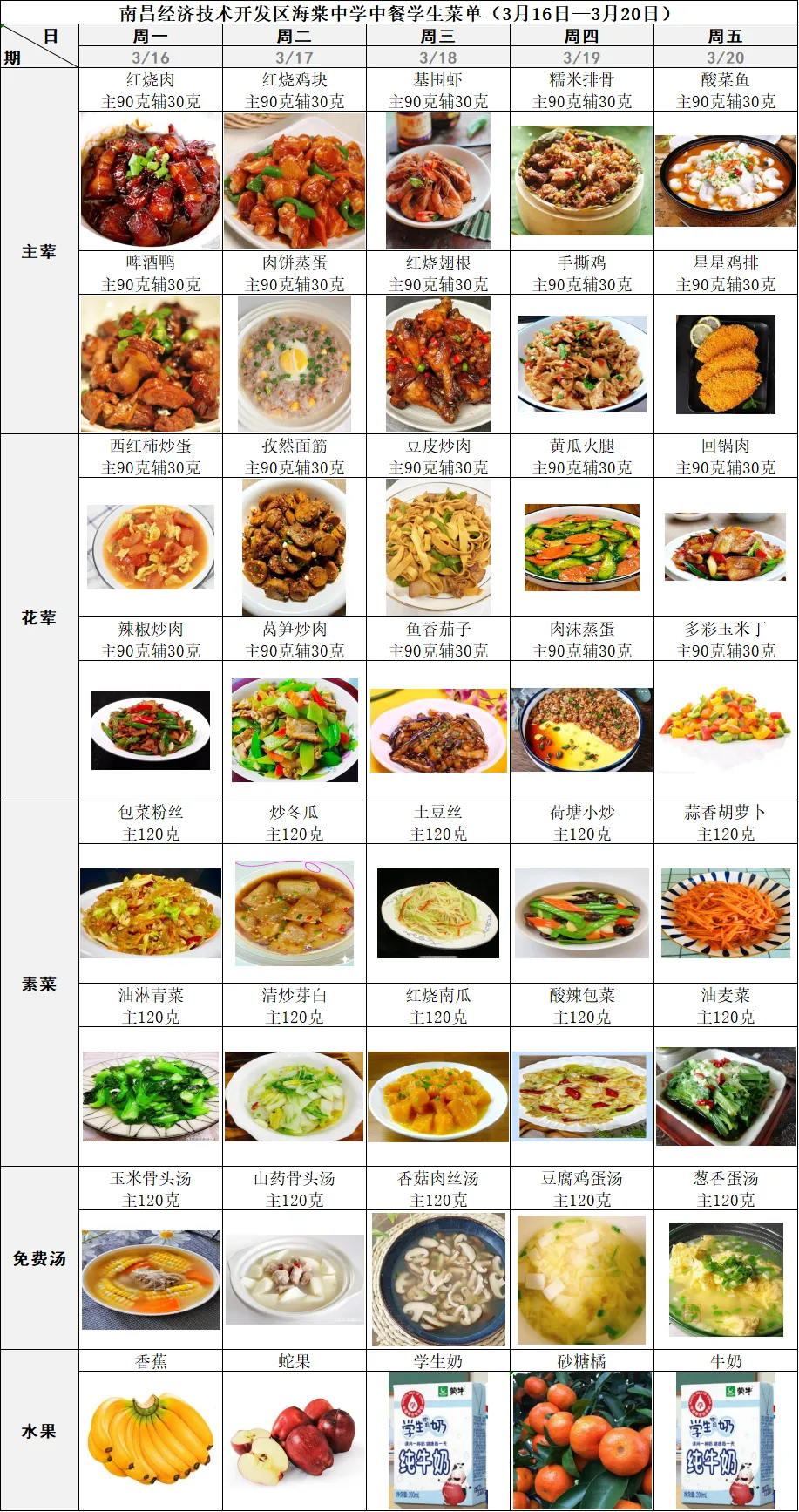 南昌二中经开校区一周食谱公示(3.16--3.20)