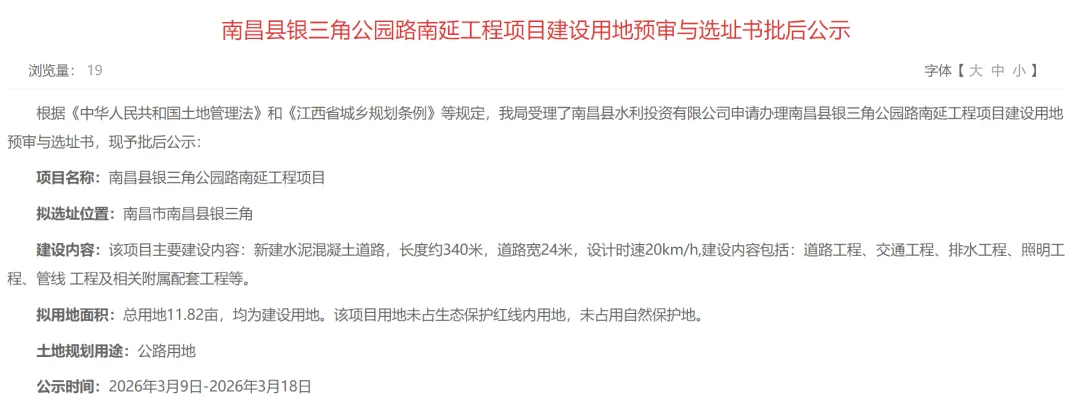南昌县银三角公园路南延工程项目拟选址位置为南昌市南昌县银三角。