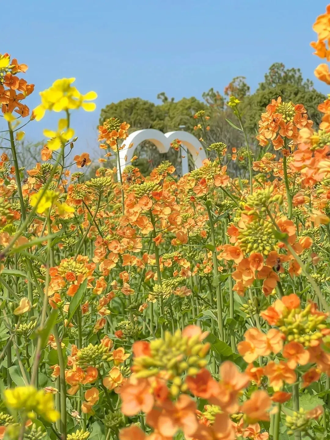这里的油菜花不再是寻常的金黄,粉的、白的、紫的、橙的,五彩的油菜花就像打翻了调色盘,将整个春天的浪漫揉碎在花田间。