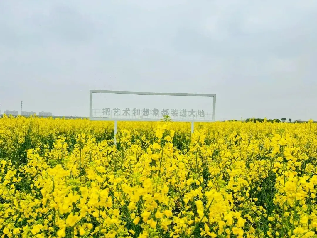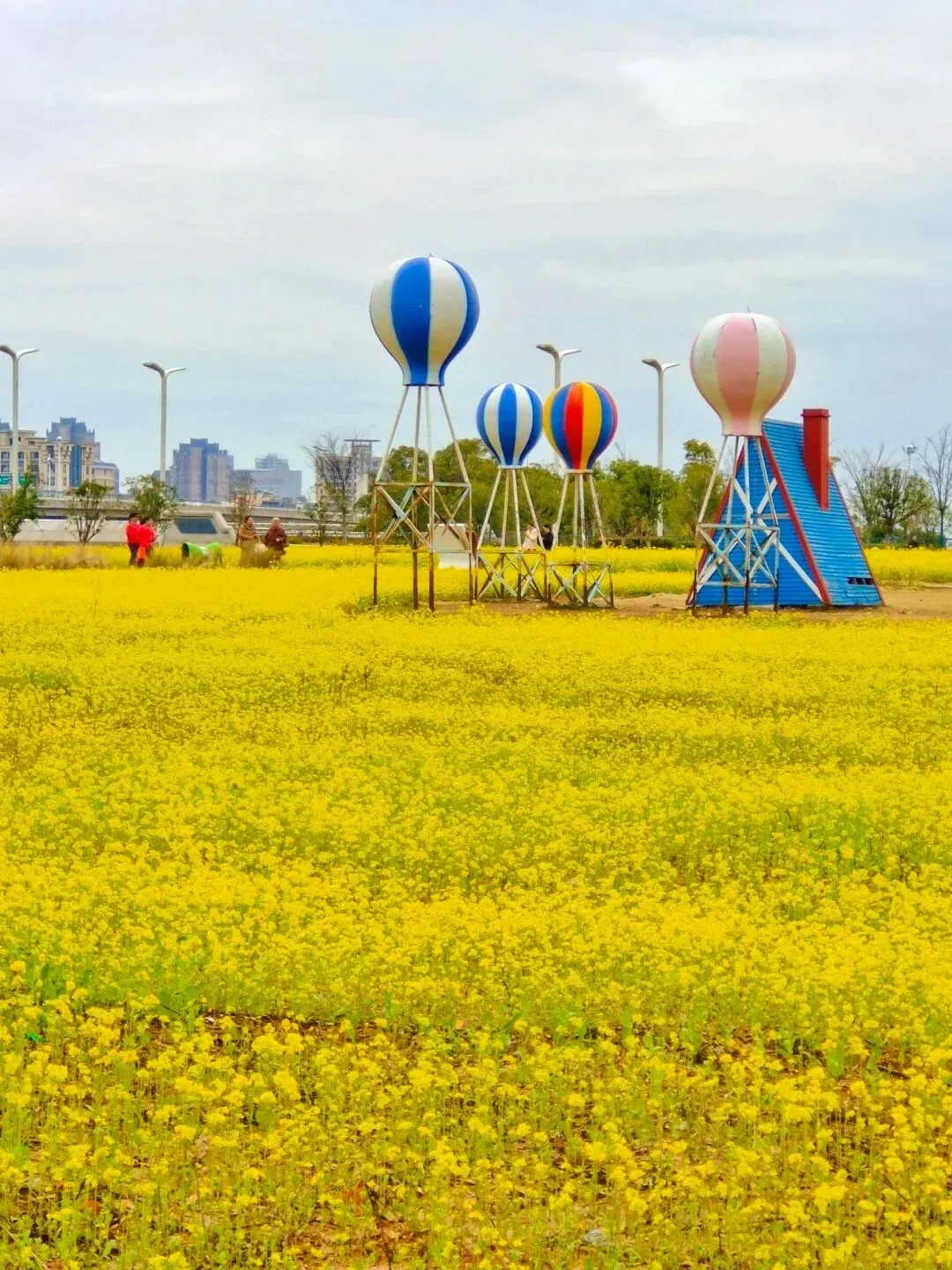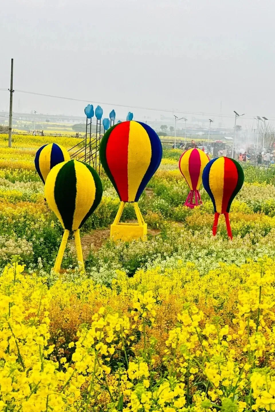 风车、热气球、金色的波浪。这里的花海是热烈的、奔放的。一簇簇油菜花紧拥在一起,铺成一片望不到边的金黄。风吹过时,花浪一层赶着一层,像是大地在呼吸。