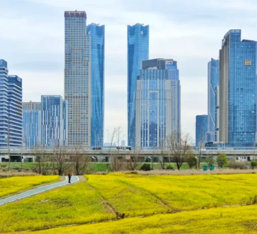 最妙的打卡点,是正对双子塔的那把长椅。坐在那里,背后是繁华的城市天际线,眼前是摇曳的春日花田——这一刻,都市与田园温柔相拥。