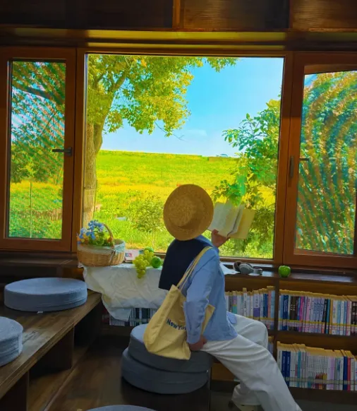 孺子书房里最靠窗的位子,是这片花海的最佳观景席。坐在窗前翻书,或者只是静静望向窗外——镜头穿过玻璃,框住花田、远山和你。