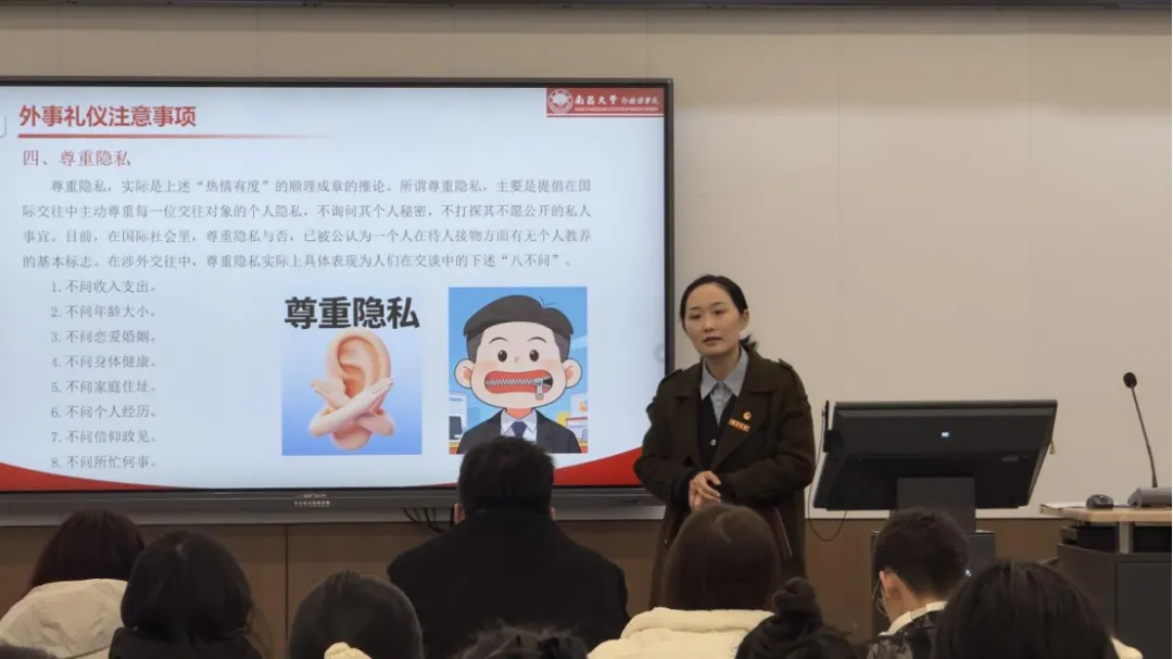 外事礼仪的讲解,让学子们明白:真正的专业,藏在每一个细节的温度里。从维护国家与个人形象的初心,到不卑不亢的从容姿态;从热情有度的分寸感,到尊重隐私的“八不问”准则,每一条原则都在提醒大家:外事服务不仅是能力的考验,更是人文素养的彰显。挺拔的站姿、专注的眼神、礼貌的倾听,这些细微的举止,都是中国青年向世界递出的温暖名片。