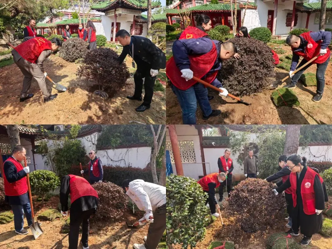 党员志愿者们齐聚滕王阁盆景花园绿化区域,开展义务植树活动。大家分工协作、干劲十足,挥锹挖坑、扶苗培土、提水浇灌,每一个环节都细致认真,现场一派热火朝天的劳动景象。经过辛勤劳作,株株新苗迎风挺立,为千年名楼增添盎然绿意,也让党员们在亲手植绿中更加深刻认识到“绿水青山就是金山银山”的发展理念。