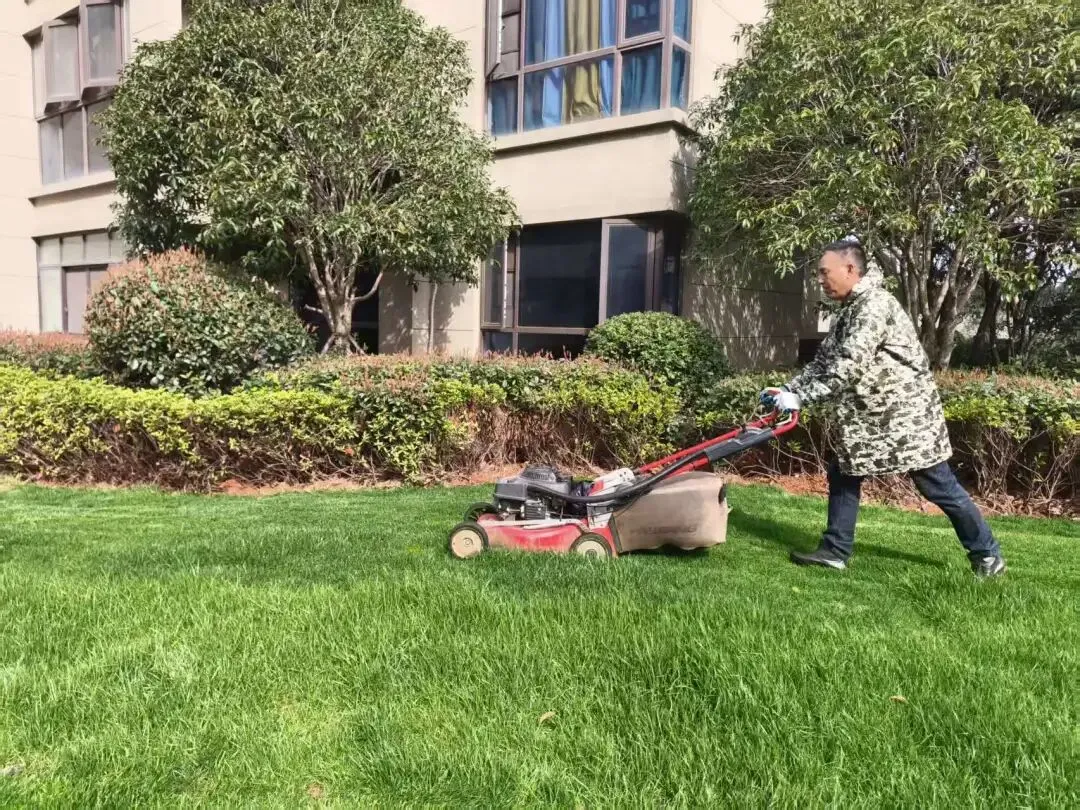 3月3日清晨七点半,绿化大叔推着割草机开始丈量这片绿地。刀片旋转的嗡鸣里,草屑飞扬成细碎的金绿。坡地横向推割,边缘细细勾勒,树穴周围的杂草徒手拔除,不伤分毫根系。割草机的轨迹在草坪上画出整齐的条纹,像给大地梳了一道又一道顺滑的辫子。