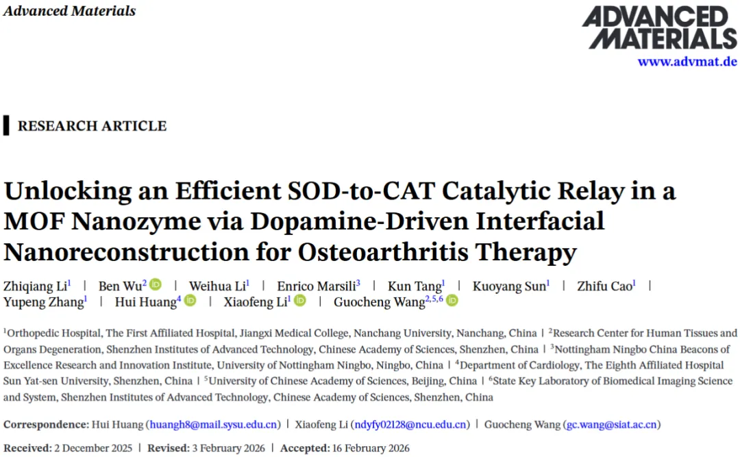 参考文献:Zhiqiang Li,Ben Wu,Weihua Li,Enrico Marsili,Kun Tang,Kuoyang Sun,Zhifu Cao,Yupeng Zhang,Hui Huang,Xiaofeng Li,Guocheng Wang;Unlocking an Efficient SOD-to-CAT Catalytic Relay in a MOF Nanozyme via Dopamine-Driven Interfacial Nanoreconstruction for Osteoarthritis Therapy;Advanced Materials, 2026; 0:e72747;Doi:10.1002/adma.72747