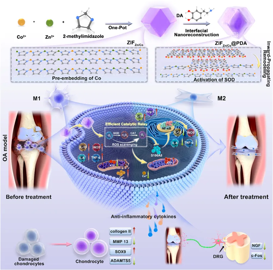 作者先用Zn/Co双金属构建稳定前体,再借助多巴胺在颗粒表面触发界面纳米重构,把原本偏静态的配位环境改造成更利于电子转移的活性界面。后续围绕“ROS清除—巨噬细胞极化—软骨保护—镇痛”这条主线,逐层验证材料设计是否真的转化为治疗收益。