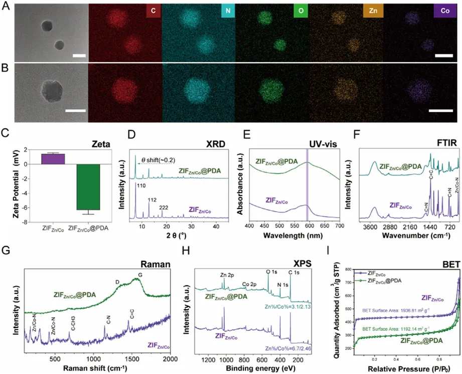 Figure 1:ZIFZn/Co与ZIFZn/Co@PDA的理化表征,包括TEM/EDS、Zeta电位、XRD、UV-vis、FTIR、Raman、XPS及氮吸附-脱附分析。